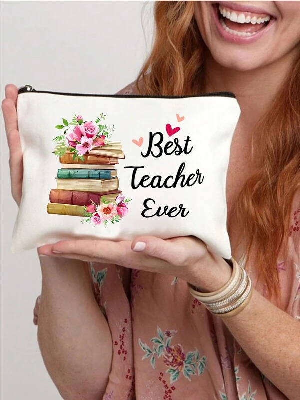 "Best Teacher Ever" Letter Cartoon Printed Cosmetic Bag, Cosmetic Bag, Print Cosmetic Bag,Makeup Bag, Gift For Girls, Cute Retro Simple Fashion Letter Pattern Printed Bag Storage Bag, Cosmetic Pouch For Small Items Storage, Storage Bag, Toiletry Bag, Clutch Bag, Lightweight Foldable Storage Bag, Simple Shopping Bag, Teacher Gift Clutch Bag, Storage For Nurses, Doctors, Teachers Bag, Suitable For Personal Travel Cosmetics Storage
