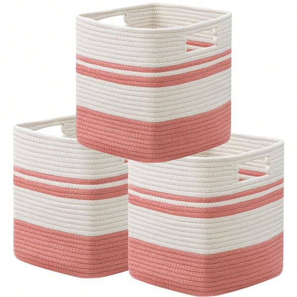 (Set Of 3) Shelf Storage Basket, Square Woven Rope Storage Basket, Small Laundry Basket, Storage Woven Basket, Toy Bin For Nursery, Living Room, Laundry Room, Bedroom, For Storing Toys, Misc, Underwear, Socks, Towels, 11x11x11 Inches, 25l, Watermelon Red And White