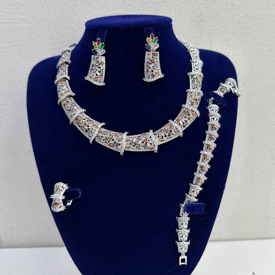 -African-Dubai Bridal Jewelry Set, Luxury Multicolor Rhinestone Necklace Earrings Set For Women, Wedding Party Accessory, 4pcs/Set