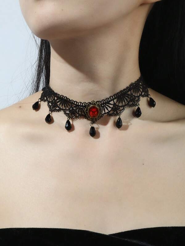 1 Black Lace Necklace, Vintage Crystal Pendant Necklace, Punk Red Gemstone Necklace, Women'S Accessory