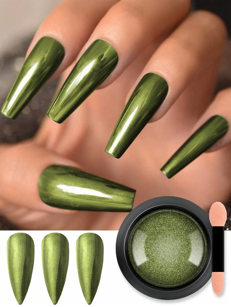 1 Jar Grass Green Chrome Nail Powder Metallic Mirror Effect Holographic Glitter Pigment with Sponge Tool for Ladies Xmas Party Nail Art Decoration