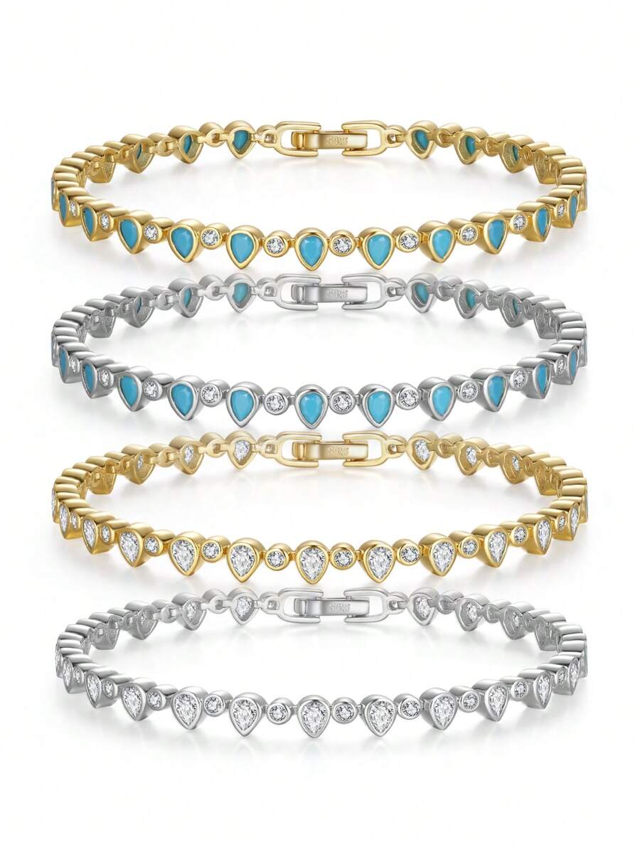 1 PC Genuine 925 Sterling Silver Turquoise Tennis Chain Bracelet Unique Waterdrop Shape Zirconia Link Chain Design Woman Bracelets Gorgeous Jewelry Best Gift For Birthday New Year Anniversary Day
