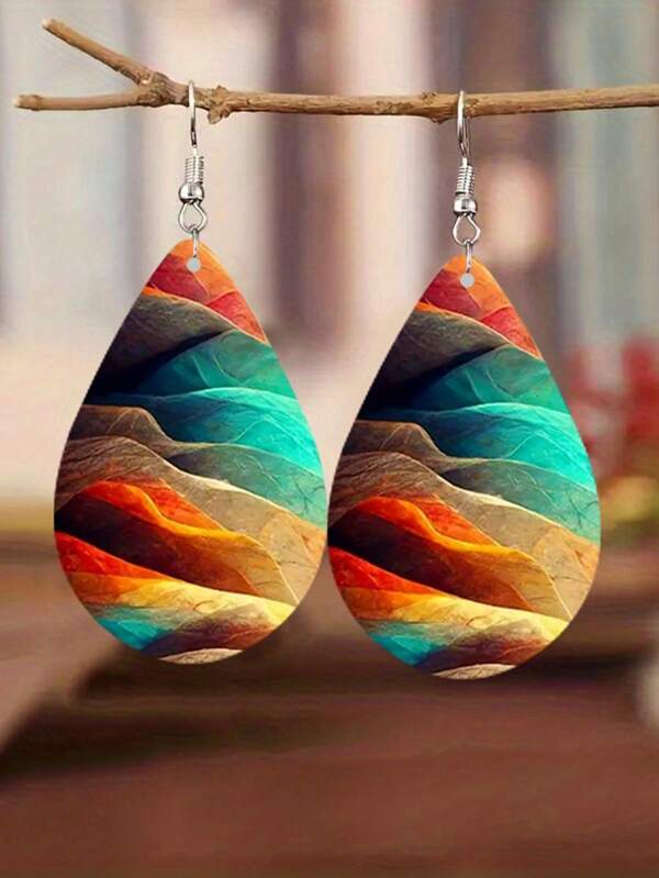 1 Pair Double Sided Rainbow Print Water Drop Wooden Hook Earrings For Women