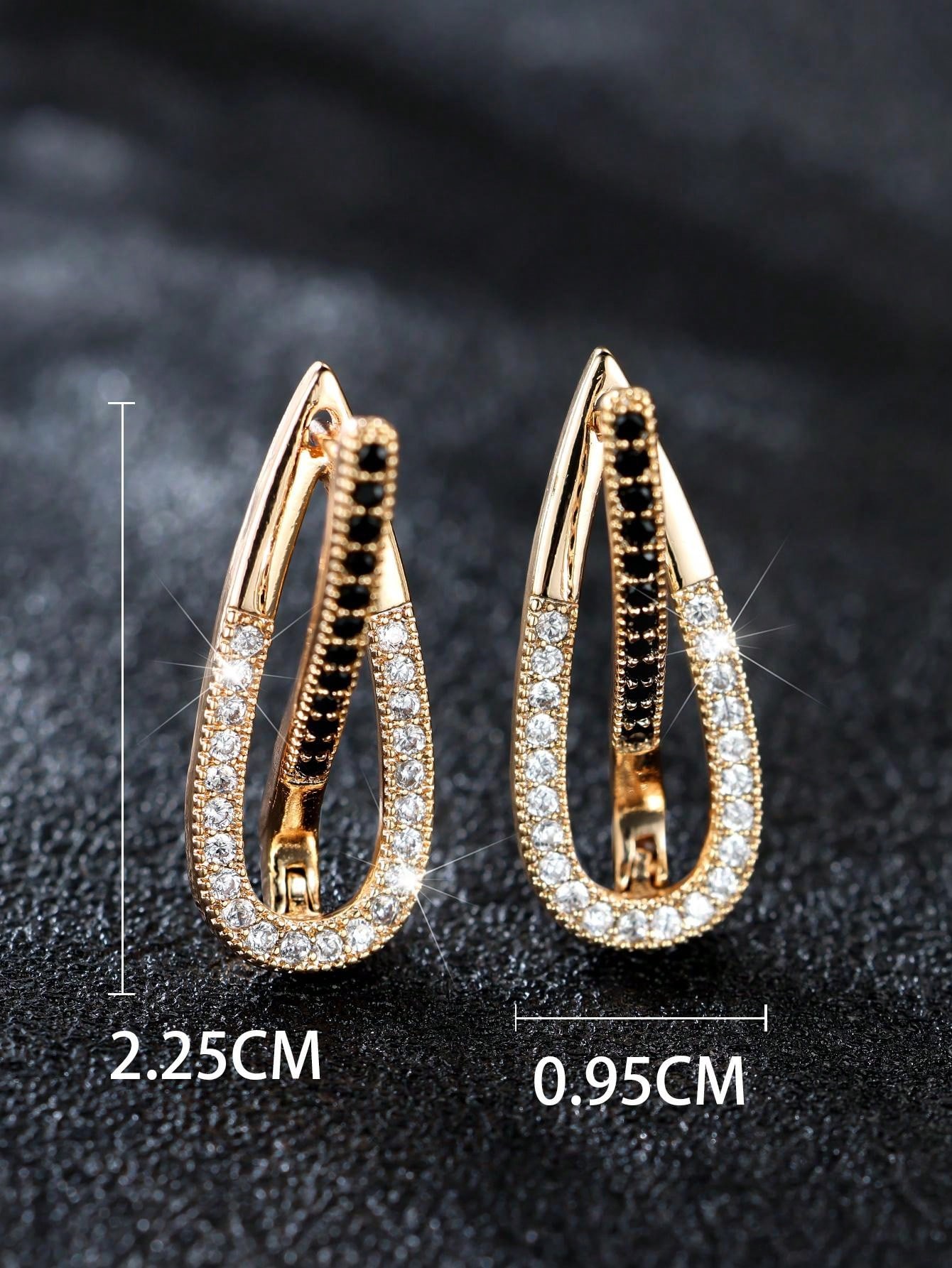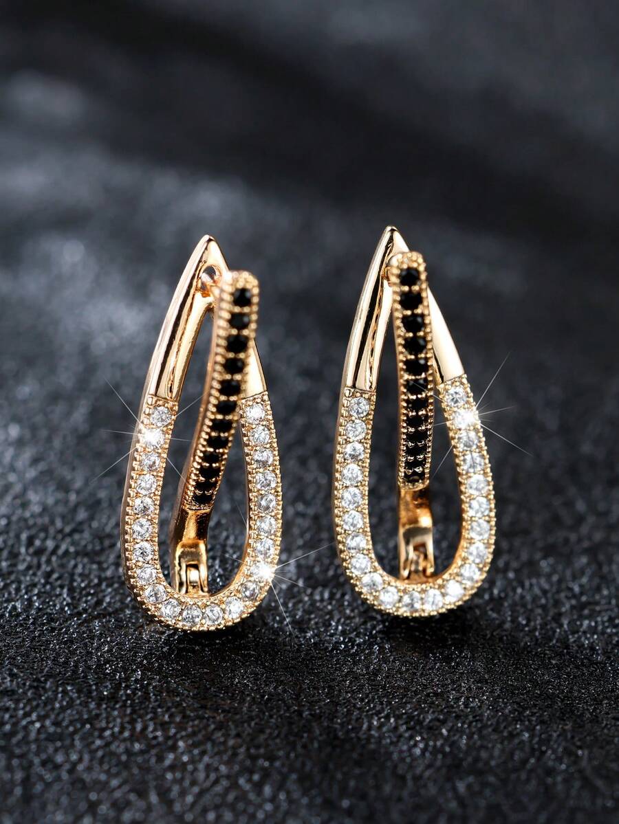 1 Pair Elegant Oval Shaped Champagne Gold Earrings With Black And White Lines Design, Delicate Fashion Ear Hoops For Women