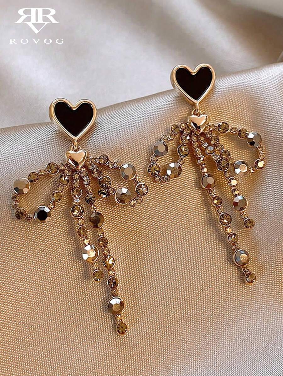 1 Pair Elegant Rhinestone Heart & Bowknot Long Tassel Drop Earrings, Luxury Charming Sweet Personalized Stylish Party Earrings For Women Valentines, Mom, Mother, Mother's Day, Gift