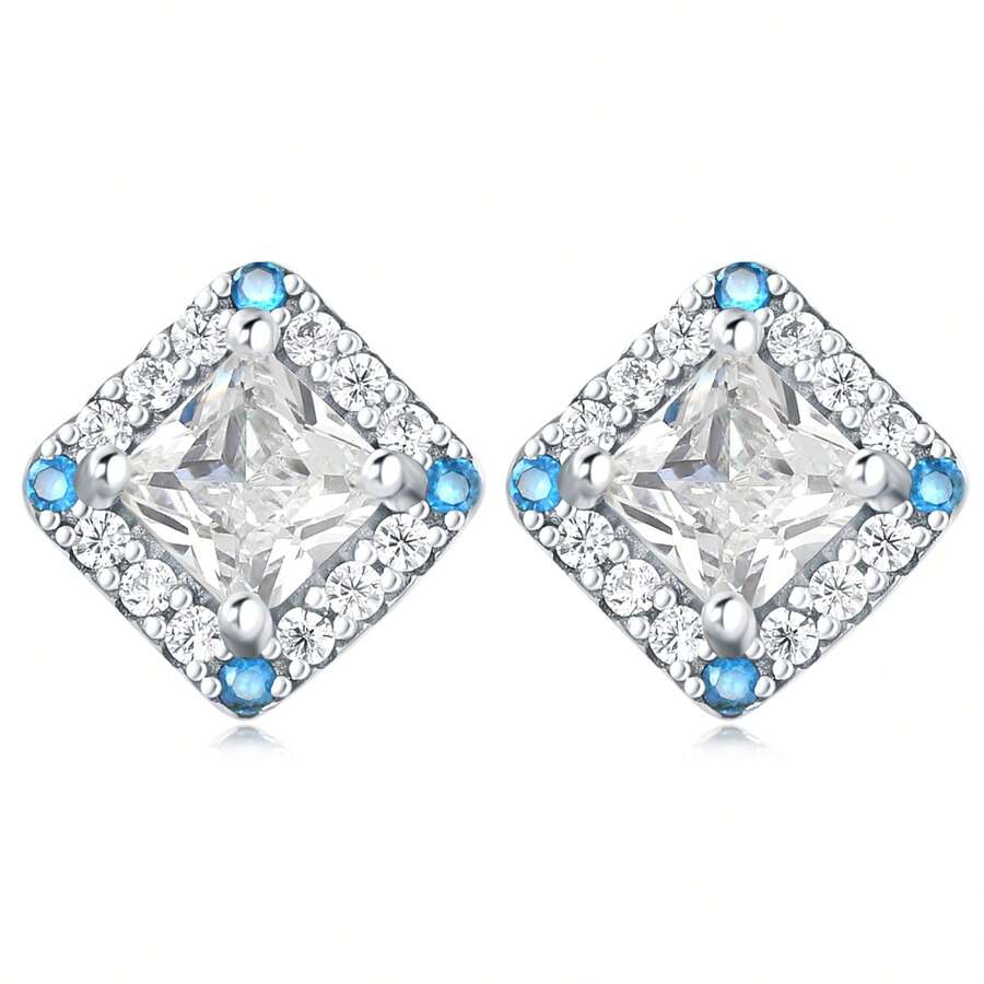 1 Pair Of 925 Sterling Silver Geometric Simplicity Square Zirconium Studded Earrings Suitable For Women Daily Wear Birthday Gift Engagement Wedding Anniversary Jewelry Women Gifts