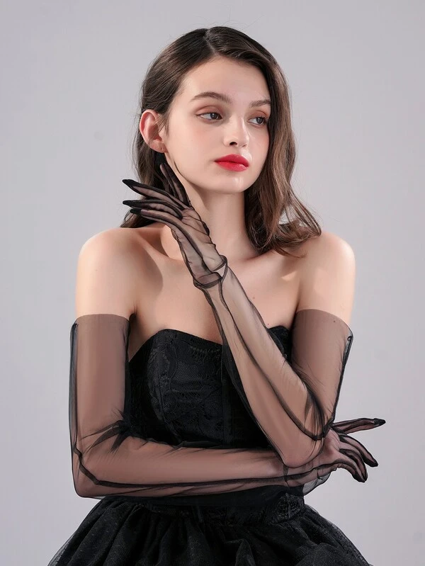 1 Pair White Beaded Bridal Gloves With Fingers And Elbow-length