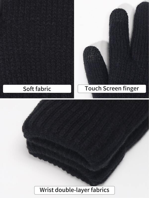 1 Pair Women's Black Winter Double-layer Plush Lined Touch Screen Texting Glove, Knitted Warm Full Finger Glove Suitable For Parties, Driving, Gaming, Cycling, Hiking, Writing