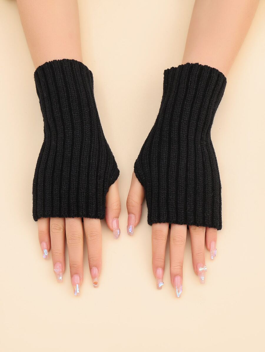 1 Pair Women's Solid Color Ribbed Knit Half Finger Gloves, Fashionable, Warm, Suitable For Daily Wear