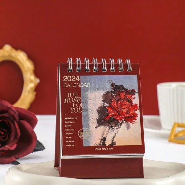 1 Pc 2024 Cute Painting Rose Mini Desk Calendar Thick Paper Monthly Desktop Stan
