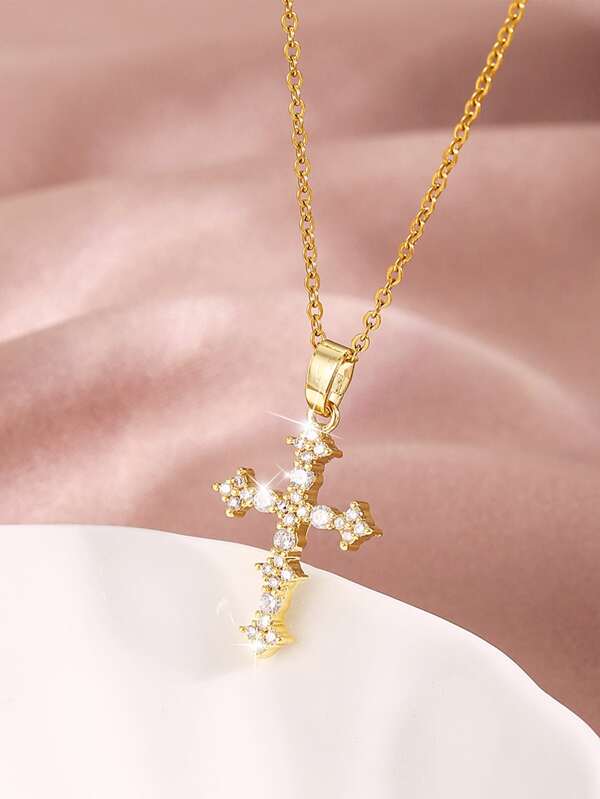 1 Pc Fashion Minimalist Shiny Zirconia Cross Pendant Necklace for Women Fine Stainless Steel Clavicle Chain Jewelry Party Birthday Gift