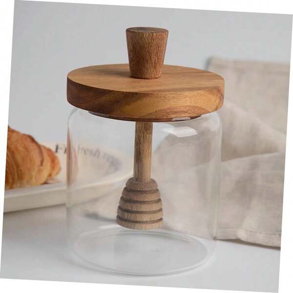 1 Pc Glass Honey Jar With Dipper, Glass Honey Pot With Wooden Dipper And Lid, Honey Container For Storing And Dispensing Bee Honey