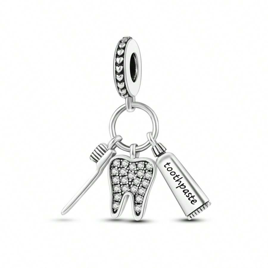 1 Pc Silver Color Sparkling Zirconia Creative Healthy Dentist Teeth Toothbrush Toothpaste Pendant Charm Fit Original Bracelet Necklace Keychain Beads For Diy Jewelry Making Women Girl Daily Accessories