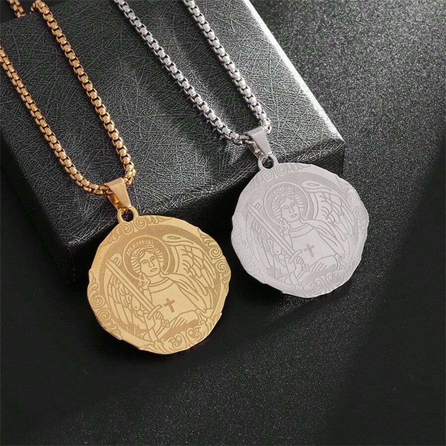 1 Piece Classic Stainless Steel Vintage Round Plate Cross Angel Necklace Ideal Necklace For Men And Women