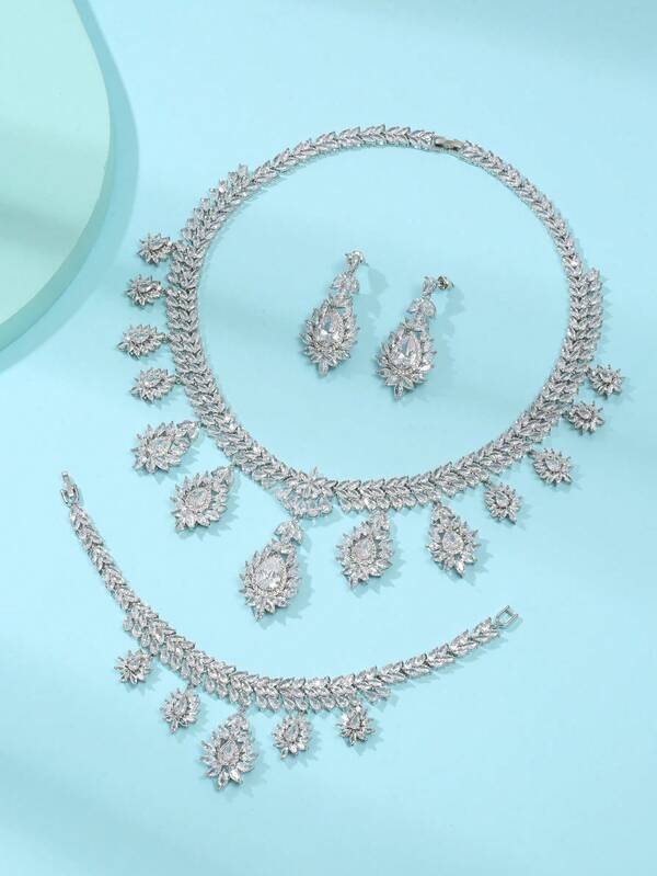 1 Set (4pcs) European & American Luxury Waterdrop Cubic Zirconia Necklace, Earrings, Bracelet Set For Wedding, Prom, Women's Fashion Jewelry For Important Festivals