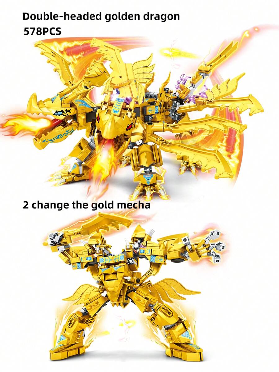 1 Set 578pcs Kids Building Blocks Gold Double-Headed Dragon Mech Toy Set, Transformable Figures Toy, Suitable For 8+ Boys And Girls Creative Puzzle Toy