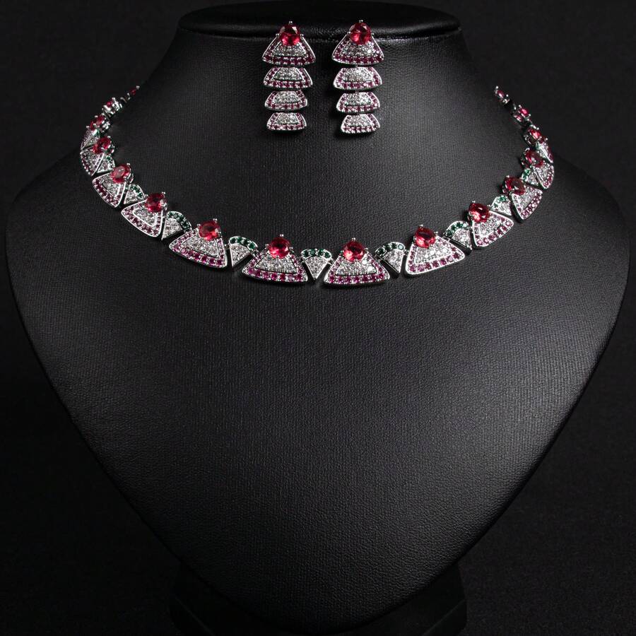1 Set Charming Pink Purple White Geometric Triangles Tennis Necklace Earrings Women Party Cubic Zirconia Jewelry Set For Engagement Pageant To Female Ladies Brides Bridesmaids
