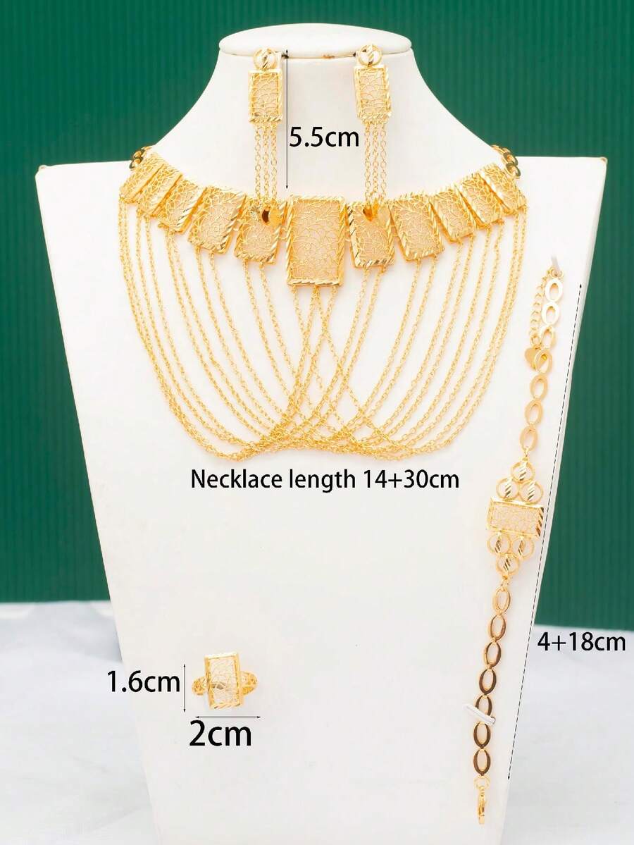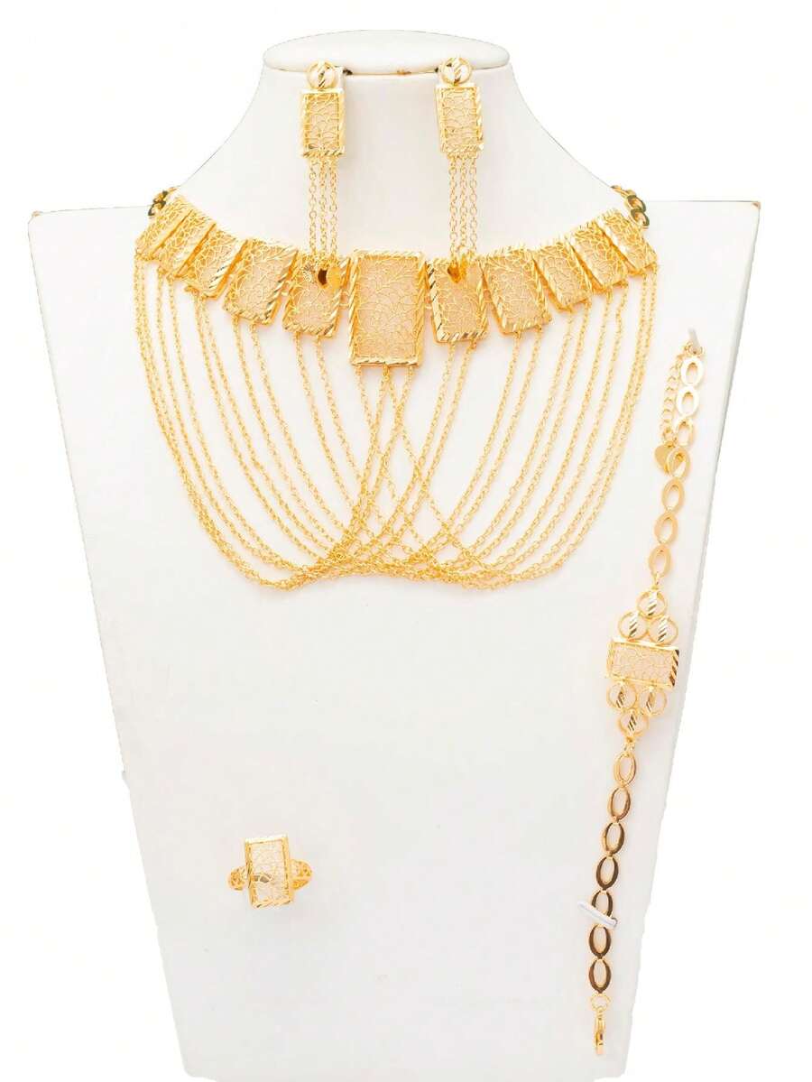 1 Set Of 5pcs Geometric Design, 18k Gold Plated And Champagne Gold Plated, Copper Material, Durable & Stretch-Proof, Luxury Dubai Style Bride Wedding Celebration Jewelry Gift Set