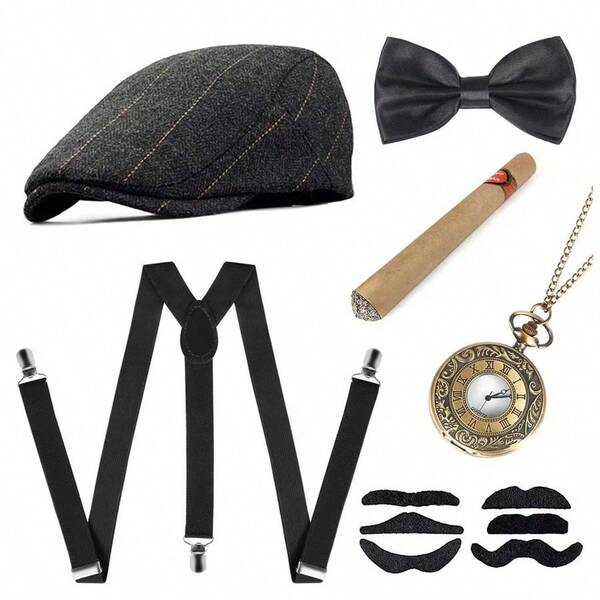 1 Set Of 6pcs Men'S Accessories Set Including Hat, Elastic Braces, Bow Tie, Vintage Classic Pattern Pocket Watch, Cigar & Mustache Prop For Festival, Party, Costume Ball Dress-Up