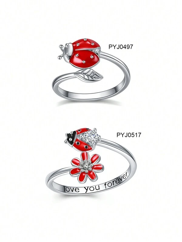 1 Stylish And Simple Decorated Platinum-Plated Cold Enamel Craft Love You Forever Insect Element Beetle & Flower Ring Suitable For Daily Wear By Women, Holiday Parties, Thanksgiving, And Gifts For Loved Ones