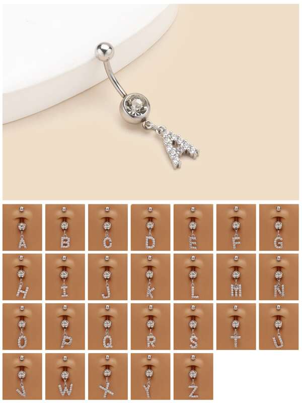 1 piece of charming and exquisite copper stainless steel rhinestone letter shape A B C D E F G H I J K L M O P Q R S T U V W X Y Z 26 English alphabet navel nail, suitable for women's daily beach outings, parties and gifts