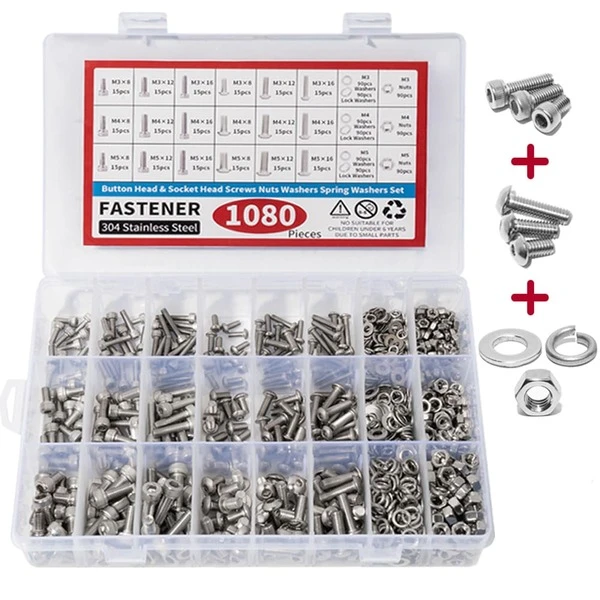 1080PCS Nuts and Bolts Assortment Kit - M3 M4 M5 M6 Screw Set - Button Head & Socket Head Metric Screws - 304 Stainless Steel - Nut & Bolt Assortment Sets.