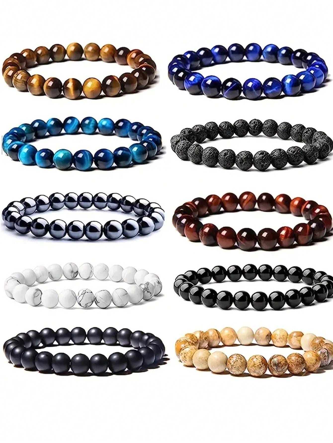 10pcs 8mm Semi-Precious Stone Round Beaded Bracelets, Crystal Healing Elastic Fashionable Beaded Bracelets, Holiday Party Jewelry Gifts For Friends And Family