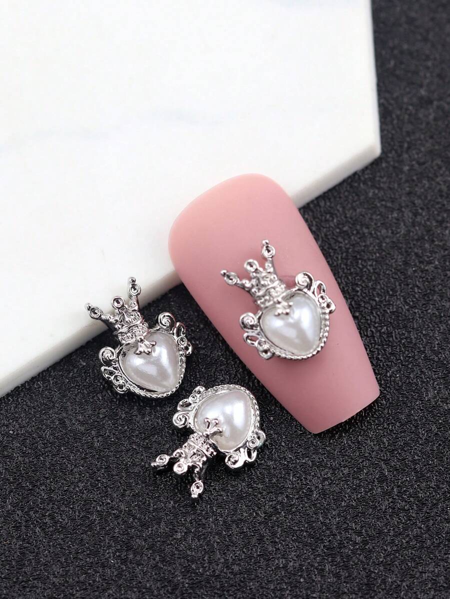 10pcs Alloy Nail Art Decorations Set In Heart And Crown Shaped Decorated With Faux Pearls, Popular On Social Media