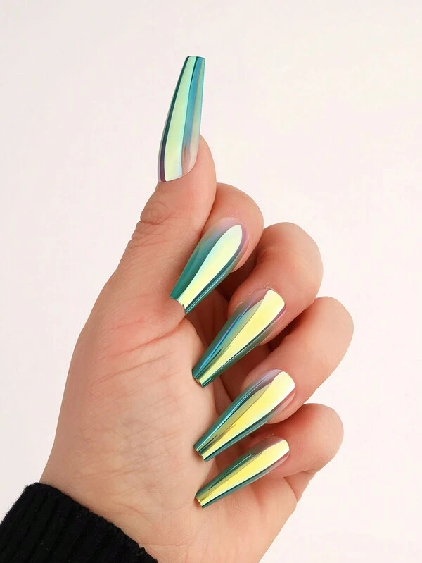 10pcs Medium Long Coffin Gradient Green Fingernail With Rub Strip 1pc, Jelly Gel 1pc, 2024 Winter Fake Nail Pieces For Women And Girls