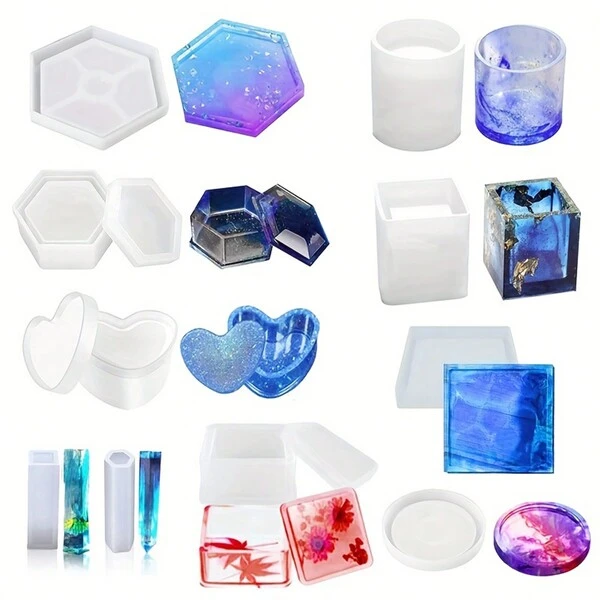 10pcs Resin Silicone Mold Large Resin Hexagon, Heart, Square, Cylindrical Circular Coaster Casting Mold Epoxy Resin Art Mold For Storage Ornaments Coaster Pen Holder Jewelry Making Home Decor