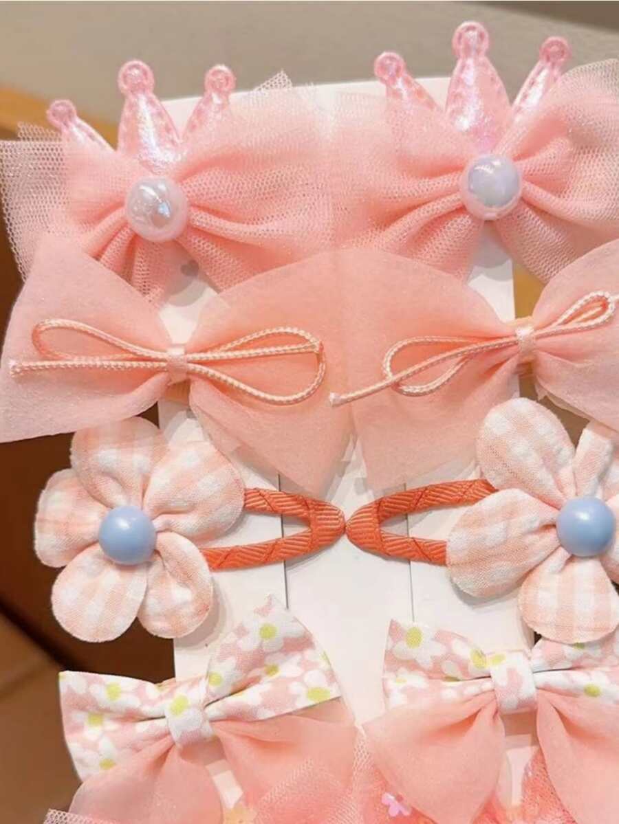 10pcs Sweet And Lovely Princess Crown, Bowknot, Imitation Pearl Decor Hair Clips Set For Girls