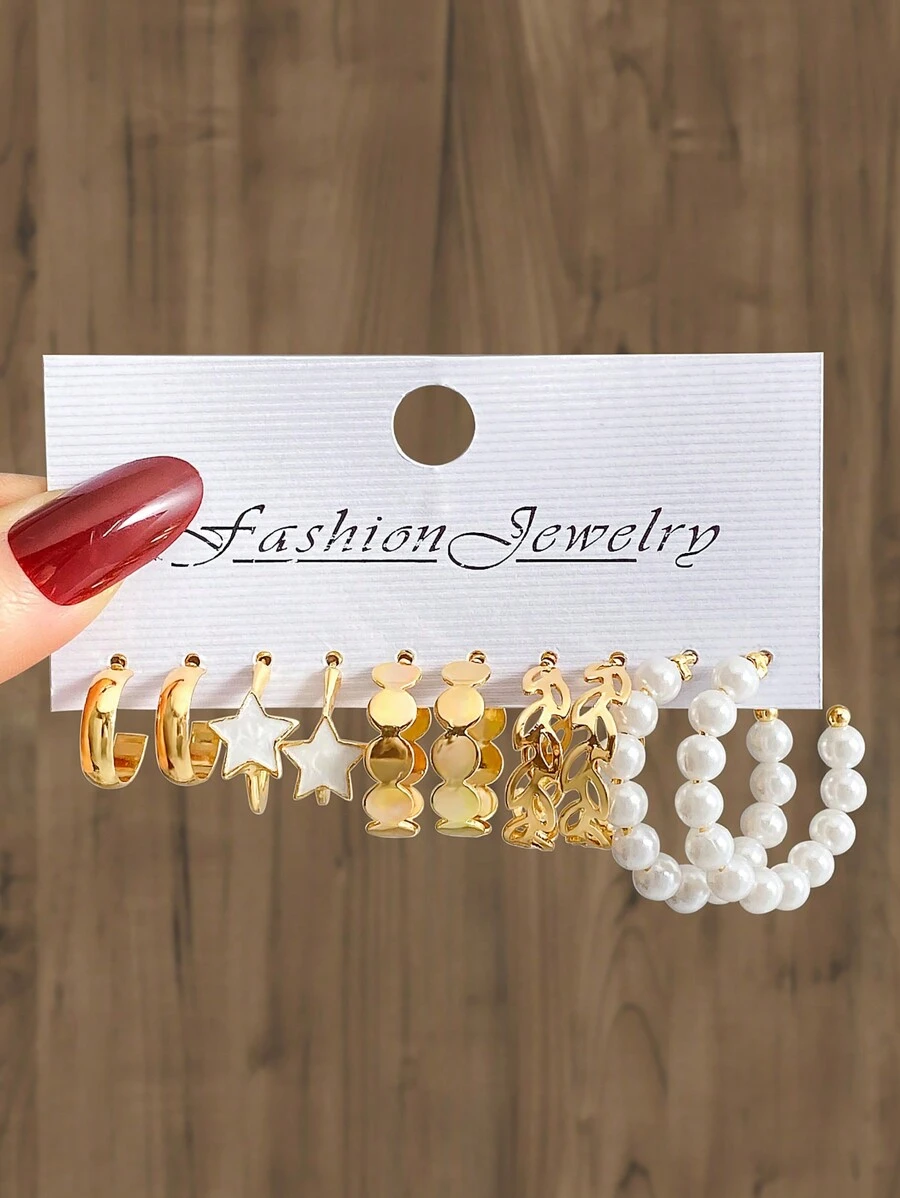 10pcs Vintage Elegant Metal White Drop Glue Starfish & Pearl C-Shaped Earrings For Women