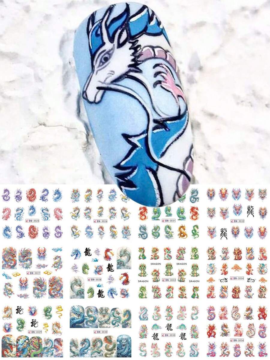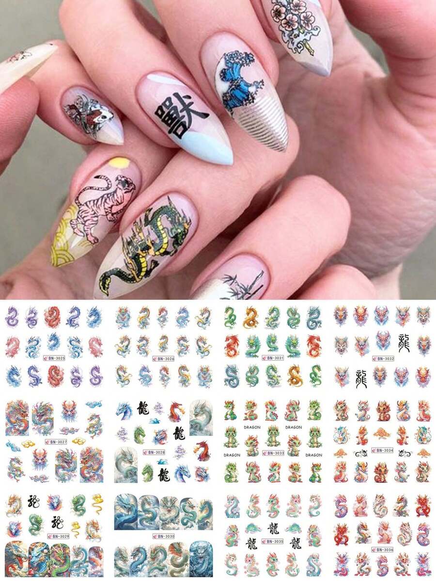 12 Design/Sheet Chinese Dragon Design Water Transfer Nail Stickers Chinese Characters Slider Decals New Year Manicure Decoration