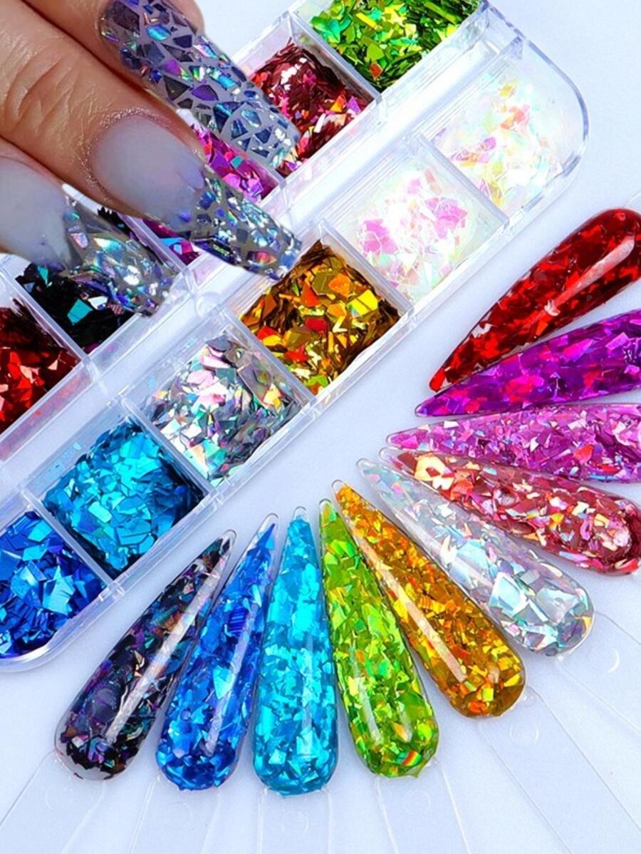 12 Grids Holographic Colorful Irregular Glitter Flakes Nail Art Accessories, Shiny Fragment Nail Art Decorations For Manicure