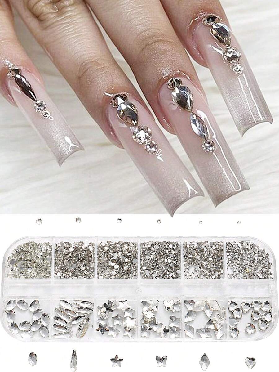 12Grids White Nail Rhinestones Flat Back Nail Gems Moon Star Heart Charms Pearl Decoration Crystal Strass 3D Flowers For Manicure