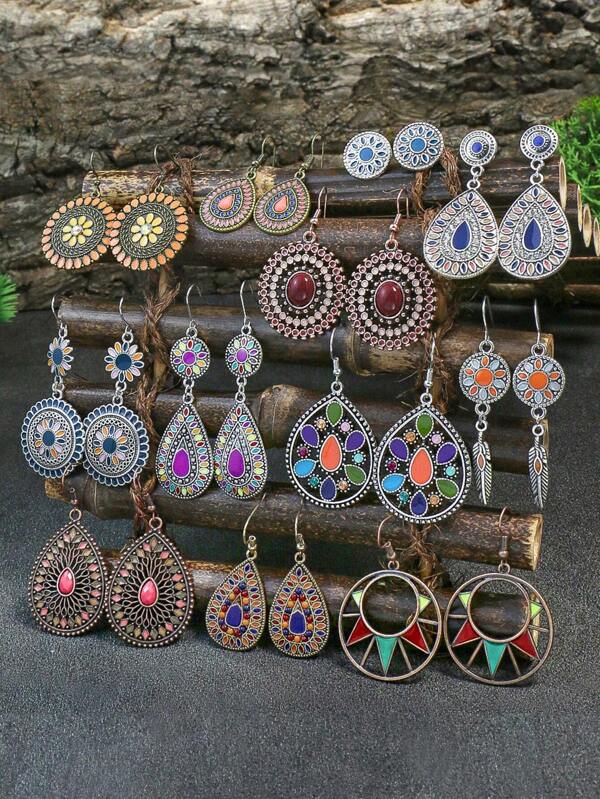 12pairs Bohemian Vacation Style Geometric Round Enamel Earrings, Vintage Accessories