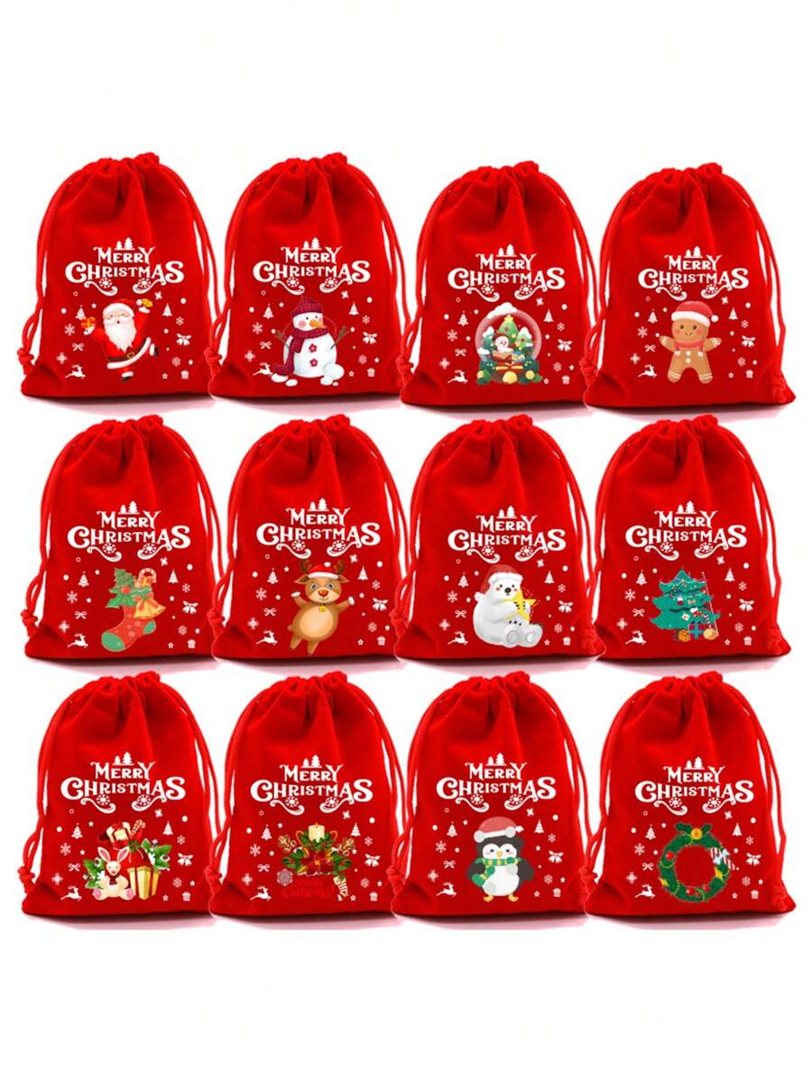 12pcs Mixed Style Christmas Corduroy Drawstring Bags, Cartoon Cookie, Candy, Apple Design Gift Pouches