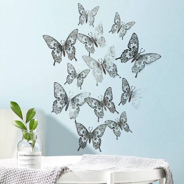 12pcs Silver And Champagne Color 3d Hollow Out Butterfly Wall Stickers, Can Be Diy With Imitation Pearl And Suitable For Bedroom, Kids' Room, Study, Dining Room, Living Room, Office, Refrigerator, Etc.