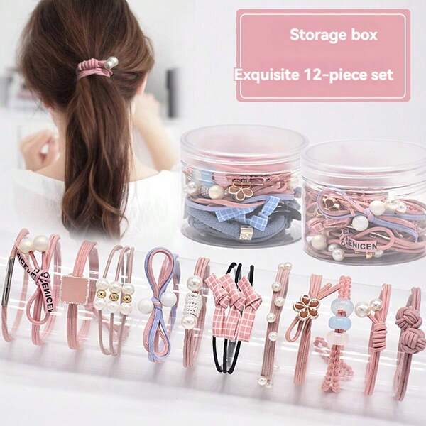 12pcs/Set Boxed Fashionable Pearl Head Rope Three-In-One Hair Band, Elastic Hair Tie, Forest Style Hair Accessory