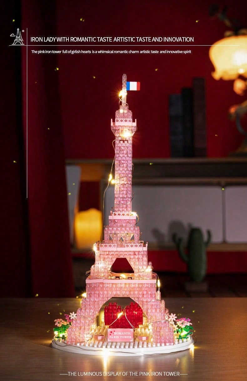 1314pcs Mini Pink Building Blocks, Free Assembly, Paris Tower Shape With Lighting Effect, Suitable For Valentine'S Day/Birthday Gift, Home Decoration