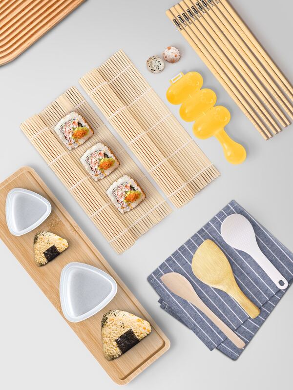 13pcs Bamboo Sushi Making Kit, Including Sushi Mold, Sushi Curtain, Bamboo Spoon, Bamboo Knife, Skinny Fish Patterned Chopsticks, Rice Ball Shaker, Rice Spoon, Various Sushi Shapes Mold. Suitable For Sushi Making At Home Or For Restaurants.