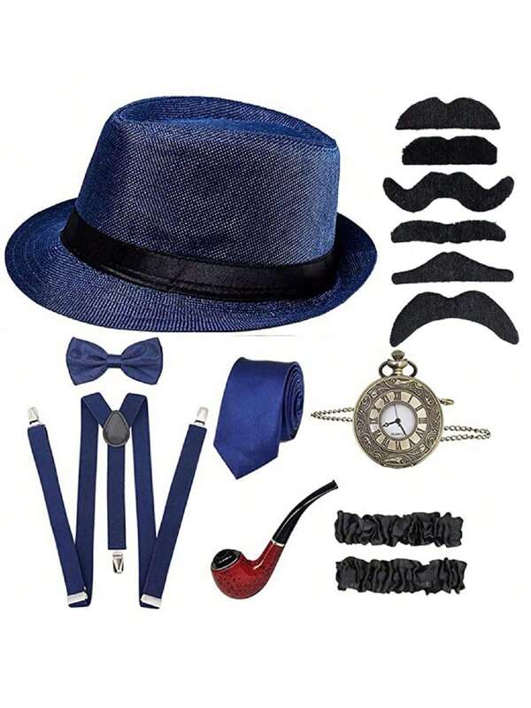 14 pcs Men 1920s Accessories for Women 1920s Men's Costume 1920s Accessories for Men Roaring 20s with Pocket Watch/Fake Moustache/Fedora Hat for Men