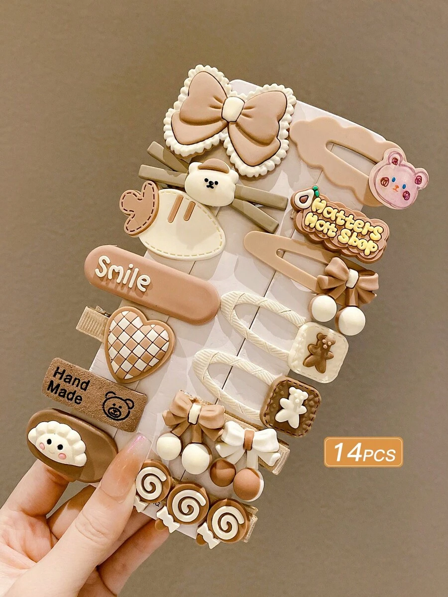 14pcs Cute Cartoon Hair Clips In Shades Of Brown For Women