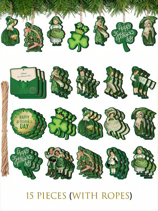 15pcs St. Patrick'S Day Lucky Girl Envelope Hat, Wooden Pendant Set, Rope Decoration For Desk & Window, Home Party Decoration, Holiday Accessories & Party Supplies