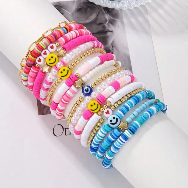 16pcs Bohemian Style Multicolor Soft Ceramic Beaded Elastic Bracelet Set, Color Random