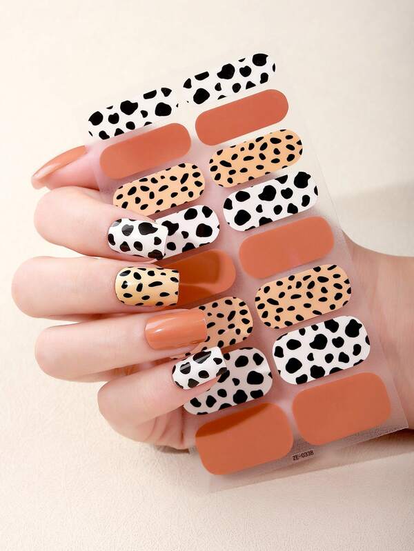 16pcs Cow Print Diy Art Nail Sticker With Floral Design, Comes With 1 Nail File, Gift For Girls