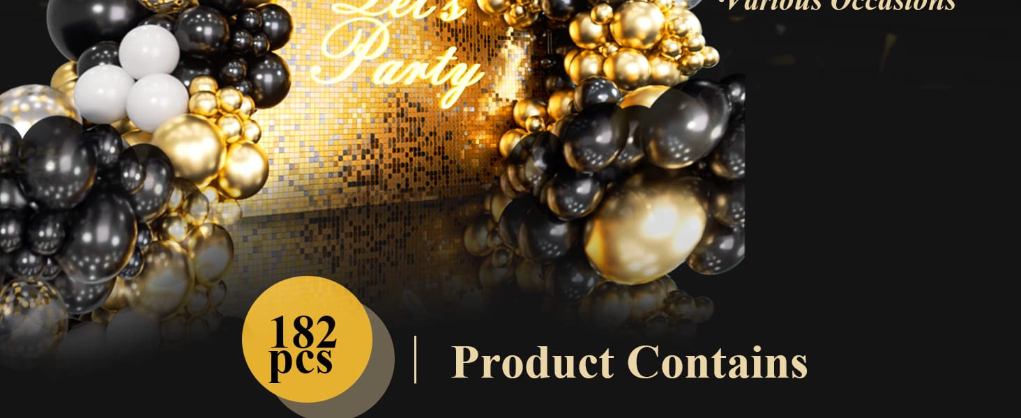 182pcs Black And Gold Balloon Garland Arch Kit, Including Diy 5/10/12/18 Inch Latex Balloons Of Black, White And Gold Colors Plus Confetti Balloons, Ideal For New Year'S Eve, Wedding Anniversary, Birthday Party Decoration
