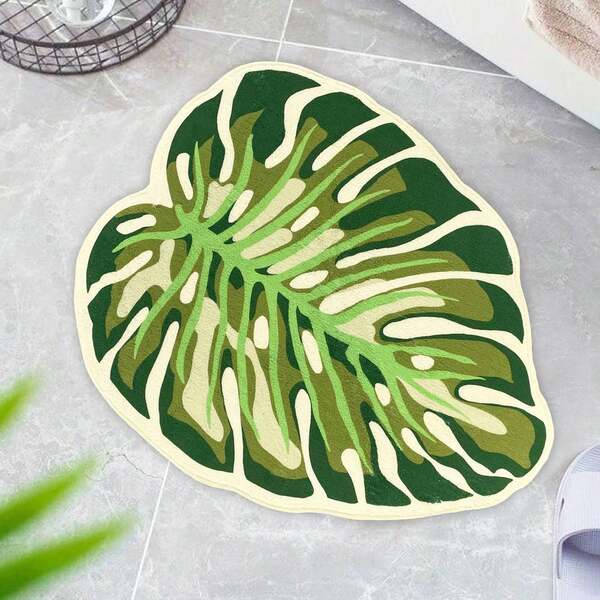 1PC Non Slip Bath Mat, Leaf-Shaped Floor Mat, Monstera Green Plant Bathroom Floor Kitchen Rug For Indoor Door Mat, Bathroom Absorbent Mat, Home Entry Mat, Bathroom Kitchen Quick-Drying Mat, Small Leaf Shaped Kids Pets Floor Carpet Living Room Bedroom Kitchen Decor
