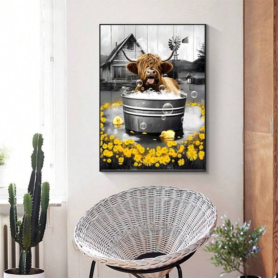 1PC Sunflower Highland Cow Wall Art Farmhouse Cow Canvas Cow Bathroom Picture Funny Bathroom Post ,Black And White Cow Bathroom Wall Decor Cute Cow Picture Home Decor For Bathroom Without Frame.