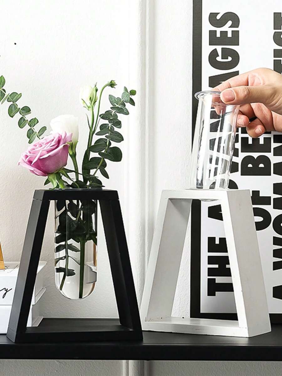 1Pcs Wooden Hydroponic Flower Vases Vintage Ins Plants Vase Pot Transparent Vase Wooden Frame Glass Plants Vase Tabletop Home Decor